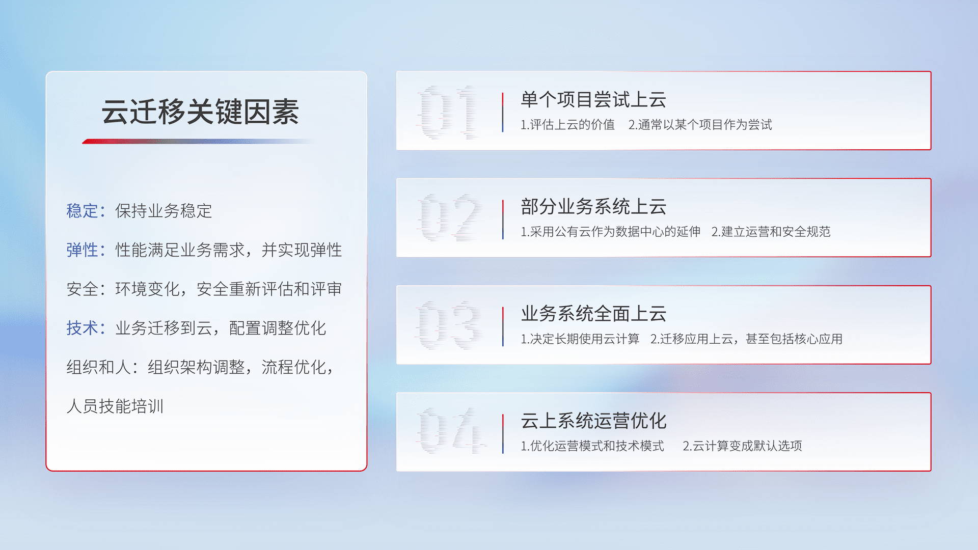结合实际业务,,,,从规划设计、、、、云平台选型、、、、云原生改造、、、、数据迁移、、集成交付,,迁移全过程为客户识别最佳上云路径,,做好风险识别管理,,,设计网络架构、、、、身份权限、、、安全审计合规、、操作审计、、日志审计、、、、监控告警策略、、、多站点容灾设计等,,对云上基础设施进行整体规划,,,,提升IT治理水平,,,,以满足弹性、、高可用、、、高性能的需求。。。。